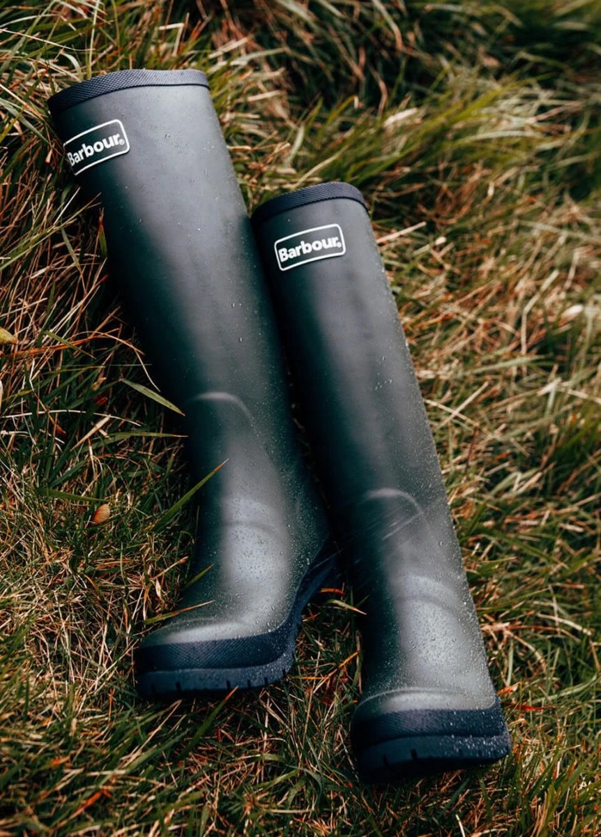 A brand new wellington boot with exclusive Barbour outsole and repeat Barbour logo detail to the backstrap.