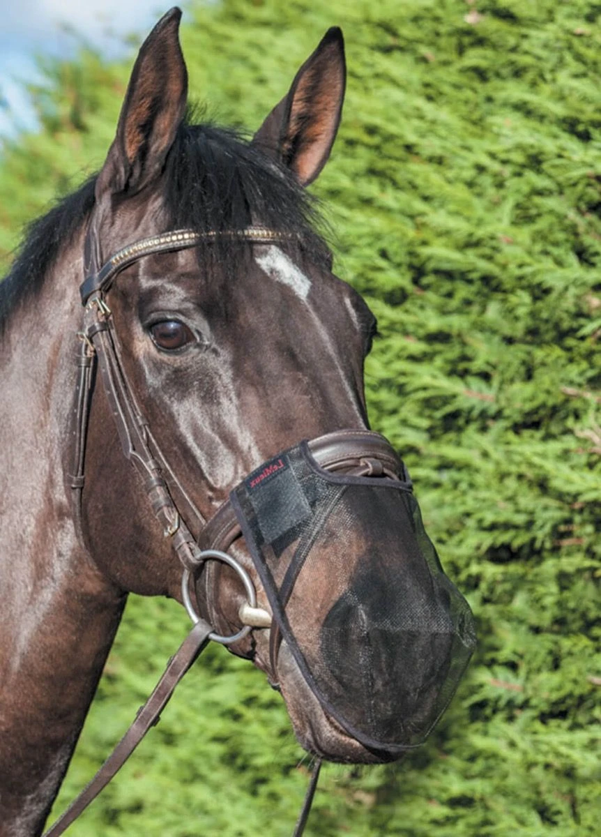 Cut away front section accommodates flash & grackle nosebands. Fine mesh effectively filters dust, pollen & other air born particles. Assists with the symptoms of head shaking & summer irritations.